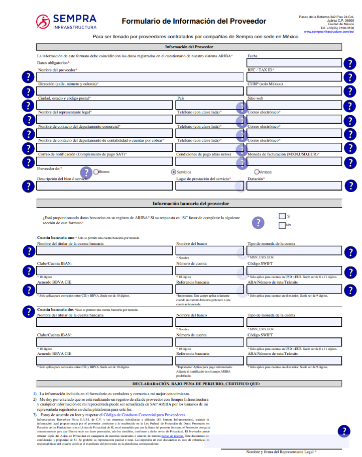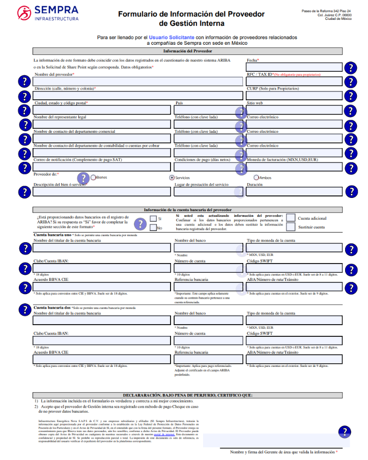 - Documento necesario para el Registro de proveedores. Este es llenado por el proveedor y para el llenado se necesita la información de la Constancia Fiscal del Proveedor y el Estado de Cuenta Bancaria. Se pueden guiar en el símbolo de interrogación (?) que aparece en el formulario para el llenado de los campos.