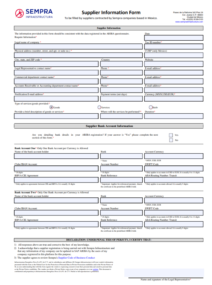 En esta guía se detallan los documentos requeridos para el proceso de registro y actualización de datos maestros de proveedores extranjeros de gestión interna y externa, así como las instrucciones de los documentos al momento de ser proporcionados a Sempra Infraestructura en la plataforma correspondiente.